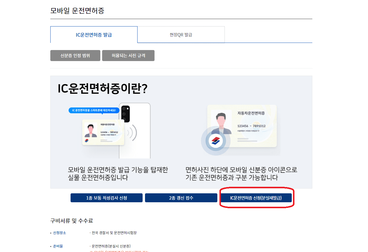 이때, 면허증 종류는 IC모바일 면허증을 클릭하셔야 합니다. 이제 완료 이 후에 가까운 경찰서 또는 운전면허 시험장에 방문합니다.
